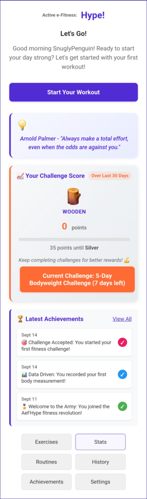 • Equipment-Specific Challenges: Challenges tailored to different equipment preferences (bodyweight, dumbbell, barbell)
