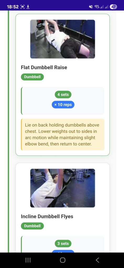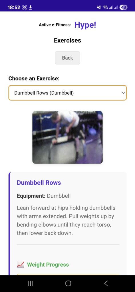 • Weight Tracking: For strength exercises, users can log weights used and view recent weight history for progressive overload